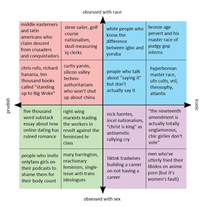 I don’t know about today, c.2024; maybe there are some self-identified women of the Right who identify as chic or who are seen as a participant in the chic elite, and also argue for their own disenfranchisement, or anyway a blissful return to swoony oblivious apathy. But if I cared enough to find someone like that to read on the Internet, I’d be wary of being trolled. In any case, not a well-populated quadrant. At least in the US.