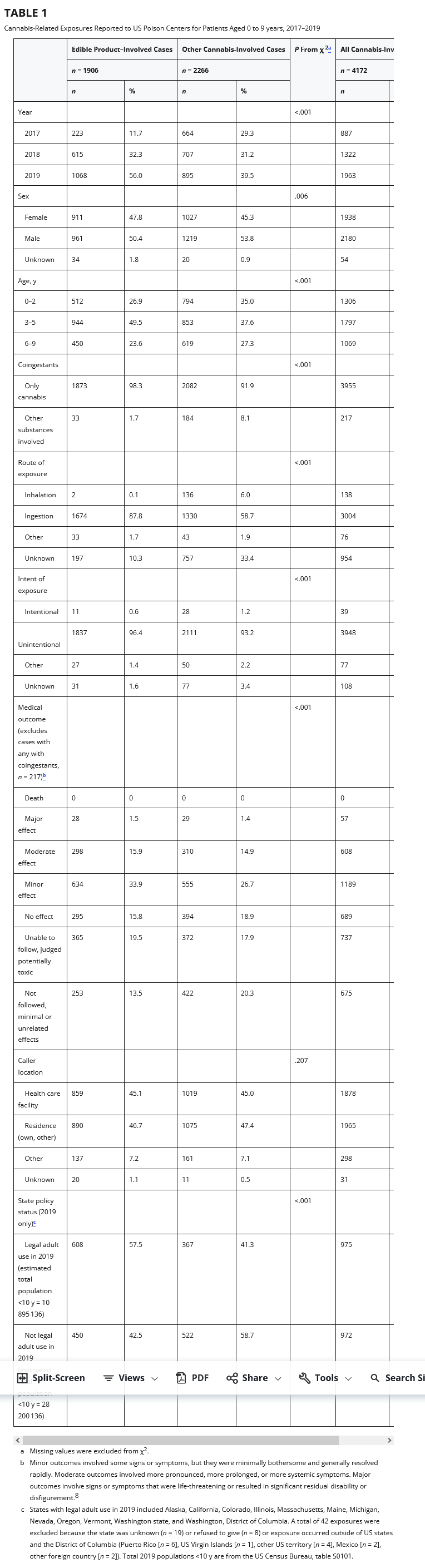 There were 4172 cannabis exposure cases among children aged 0 to 9 years during the study period, of which 45.7% (n = 1906) were associated with edible cannabis products (Table 1). (See below. ed.)