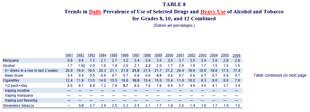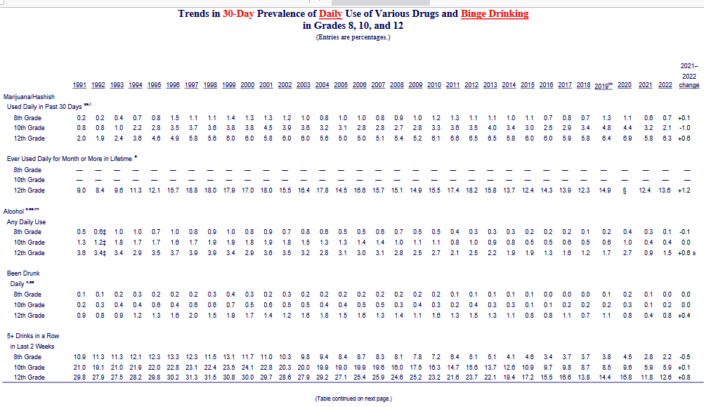(Italics mine. For figures from an on-topic nationwide survey by the U. Michigan Monitoring The Future Project covering the years 1991-2022, refer to the chart at the bottom of the page.)
