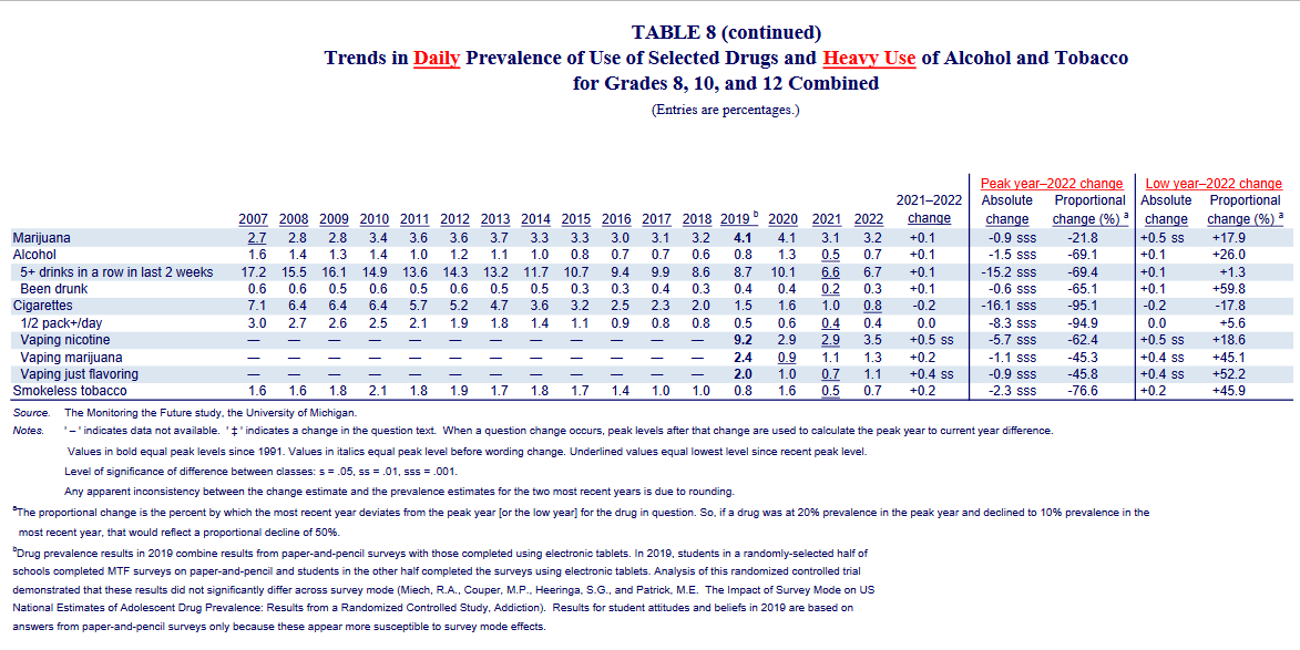 Long-term context: the chart below shows the measured 30-day prevalence of Daily marijuana and alcohol use by 8th grade, 10th grade, and 12th grade students, 1991-2022, as surveyed by the Monitoring The Future program of the University of Michigan. (All charts provided should be expandable with a touchpad or mouse click.)